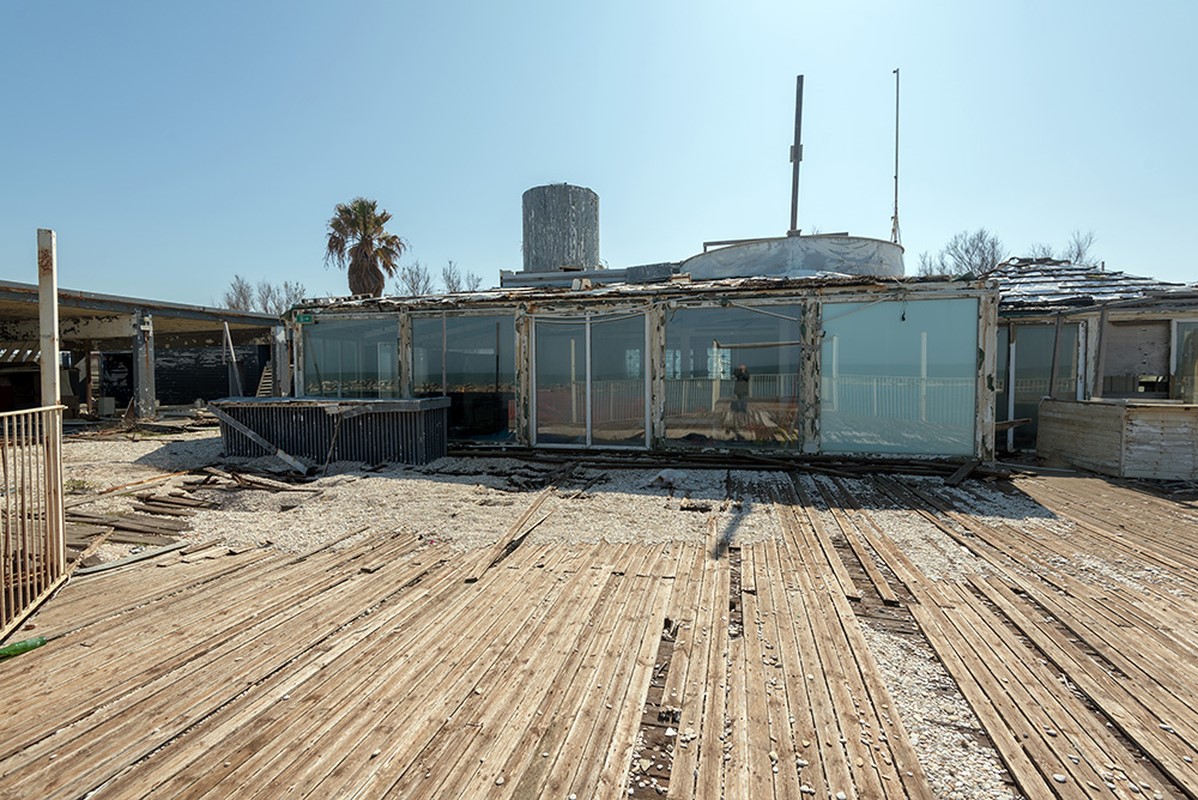 Sorto nel 2006 dalle ceneri dell’Acapulco, il Naomi era partito col botto nella prima stagione, sotto la direzione artistica del popolarissimo Andrea Roncato, attore di innumerevoli pellicole comiche e commerciali, tra le quali spicca il personaggio del tamarro Loris Batacchi, capoufficio pacchi in “Fantozzi subisce ancora” (1983). Grazie alle sue entrature nel mondo dello spettacolo, Roncato riuscì ad assicurarsi la costante presenza di attori, veline e cantanti in voga quegli anni, assicurando al piccolo dancing una visibilità che lo rese ben presto uno dei luoghi più ricercati per la movida della media riviera adriatica. Dopo qualche anno il Naomi, che aveva esteso le sue aperture alle serate invernali, incluse il ristorante Blanco, capace di raffinate specialità di pesce, ma ormai Roncato aveva spiccato il volo e l’attività cominciò a declinare fino all’improvvisa chiusura del giugno 2018 per irregolarità varie, inerenti la sicurezza e mancati pagamenti dei canoni demaniali annuali. Il Covid sopraggiunto poco dopo determinò la definitiva chiusura dello chalet sul mare, cui nel frattempo era stata revocata la decaduta concessione balneare. Ora restano solo le polemiche politiche e il rimpallo delle responsabilità sull’inanità delle giunte presenti e passate, che non avrebbero saputo cogliere in tempo l’offerta della Federazione Italiana Vela per un recupero della struttura con un’offerta che purtroppo avrebbe coperto solo il 50% del costo complessivo in carico al Comune, alle prese con la carenza di liquidità nota agli altri enti locali nazionali. In tutto ciò, il Naomi sprofonda letteralmente in mare, ormai precariamente sospeso sui pali ferrosi erosi dalla ruggine e dalla salsedine, esposto su un punto costiero non riparato dagli scogli, dove le onde lo raggiungono senza trovare ostacoli, e con la pavimentazione lignea sospesa squarciata in più punti che disegnano un percorso di avvicinamento alla costruzione simile alla scacchiera di una dama. Da più parti si levano voci per risolvere quello che ormai è solo un ingombro antiestetico e pericoloso per i cittadini, ma i costi sono stimati intorno ai trecentomila euro e nelle casse comunali proprio non ci sono. L’elegante struttura in bianco laccato, affacciata sul litorale è ormai solo un amaro ricordo e, considerato il tempo trascorso invano dalla sua chiusura, chissà che non tocchi proprio al mare risolvere la questione.