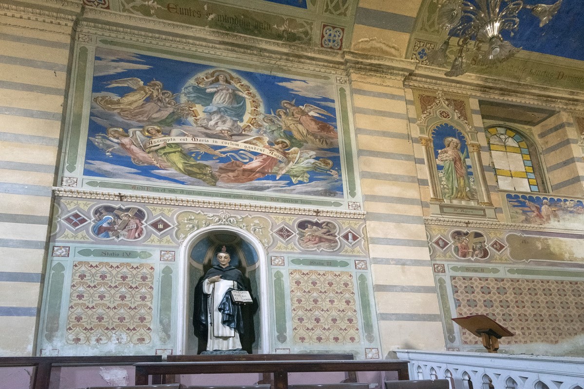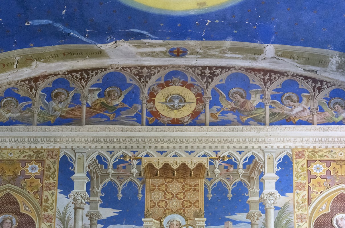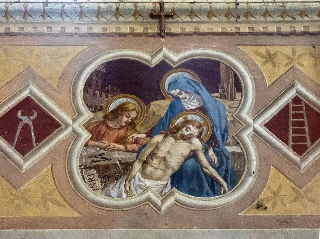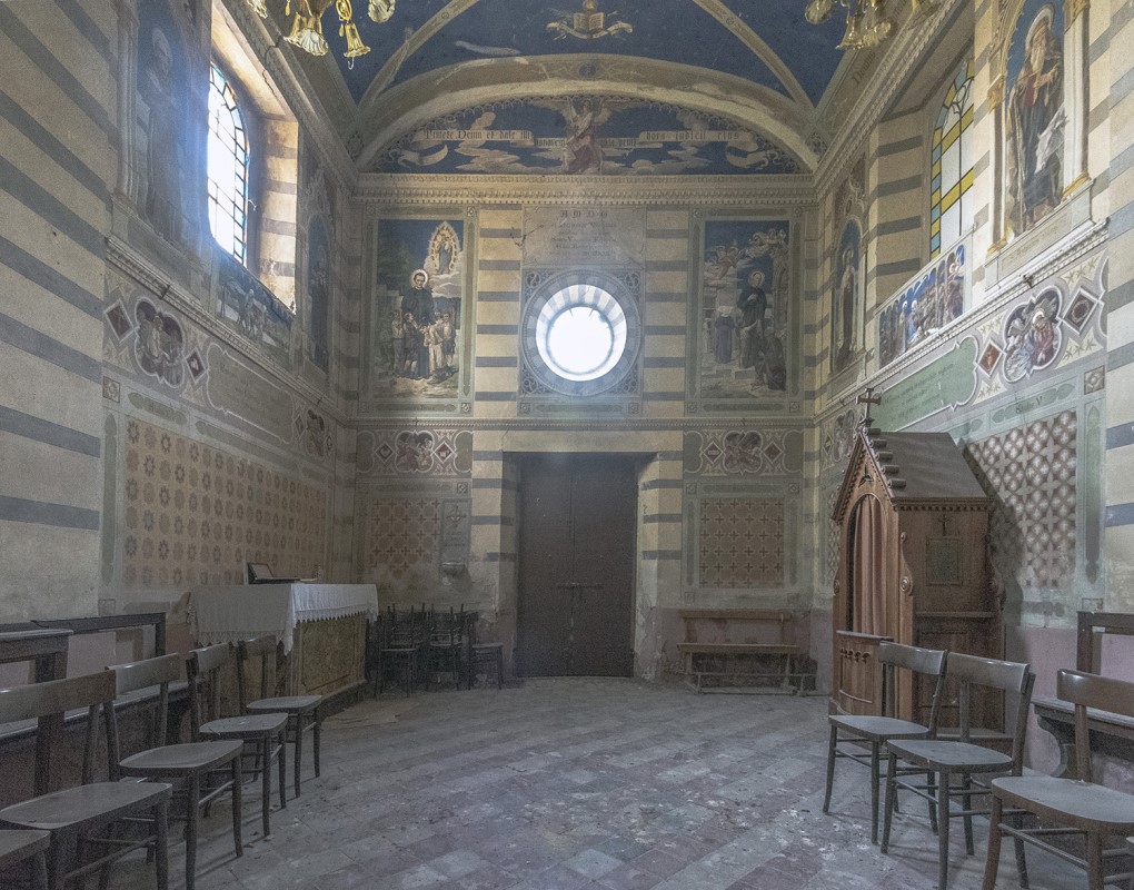 Raramente la fortuna guarda dalla nostra parte e ci assegna un premio inatteso, se non addirittura immeritato. Stavo osservando un percorso su googlemaps e mi veniva segnalata una chiesa apparentemente in normale servizio e senza indizi che facessero suppore il suo stato di abbandono. Incuriosito unicamente dall’insolita intitolazione, sono andato a cercarne i dettagli e, con mia grande sorpresa, sono stato introdotto al suo interno tra gli scintillanti affreschi. Si trattava nientemeno che di un luogo che stavo cercando da anni senza successo e me lo ritrovavo a pochi chilometri da dove abito provvisoriamente a causa del terremoto del 2016. Ho subito allertato il mio fedele sodale di esplorazioni, che mi ha prontamente assicurato la sua presenza per l’indomani. La chiesa si è rivelata tutto meno che attrattiva dall’esterno, un classico tardo ottocento di nessun pregio che la qualifichi, ma la sorpresa, come sapevo, era all’interno, dove c’è da perdere la testa per le incredibili decorazioni che ne segnano le pareti, l’abside e il soffitto a botte, richiamando un eclettismo d’impronta tardo gotica. L’edificio fu eretto della seconda metà dell’800 da una nota famiglia nobile locale. Nello specifico urbex, la storia si fa interessante quando E.B., figlio della contessa proprietaria, ereditò nel 1909 la villa di famiglia con annessa chiesa poco distante, che prese ad affrescare completando l’intero progetto in soli tre anni – dal 1932 al 1935 -, confermando le sue doti di umanista a tutto tondo, con una chiara inclinazione per la pittura e la poesia. Gli interni della chiesa danno spazio a temi del Vecchio come del Nuovo Testamento, fra i quali spiccano le opere della Creazione e Redenzione, le suggestive stazioni della Via Crucis riunite in cornici quadrilobate, oltre a decori d’ispirazione protocristiana presenti sulle pareti d’ingresso. La chiesa è chiusa al pubblico, abbandonata da tempo, in parte colpita dal terremoto del 2016 e minata da quella che è riconoscibile come umidità da risalita. Io e il mio compagno di esplorazioni siamo rimasti sbalorditi alla vista di tanto splendore e ci saremmo fermati per più tempo, ma a un certo punto un pastore maremmano aveva iniziato ad abbaiare a più non posso sul prato antistante la chiesa, allertando un inquilino e la caccia era bene finisse lì. Quello che ho poi appreso sulla chiesa ha del sorprendente, dato che l’intitolazione è a San Vincenzo Ferreri, dunque una non delle più comuni. Già, ma chi era costui? Nato in Spagna nel 1350 e morto in Francia nel 1419, il nostro divenne ben presto un frate domenicano, notoriamente un ordine particolarmente agguerrito sui temi della predicazione, che lui spingeva a contenuti estremi sostenendoli con richiami alle profezie bibliche. Dotato di un forte carisma personale (per chi segue l’astrologia, era un ariete centrale e dunque la cosa non deve sorprendere), Vincenzo Ferreri si immedesimava a tal punto nel suo ruolo da autodefinirsi l’Angelo dell’Apocalisse. Condusse sempre vita austera e attraversò gran parte dell’Europa a piedi, compiendo decine di miracoli al giorno tra i più disparati, tanto che «era un miracolo quando non faceva miracoli», come sostenevano i suoi seguaci e i biografi, che ne furono soggiogati a tal punto da tramandarne le gesta descrivendolo come un dominatore della natura, dato che, secondo quanto riferito, guariva i malati, liberava gli indemoniati, resuscitava i morti, convertiva peccatori, eretici e non cristiani e, per sovrammercato, proteggeva pure dai terremoti. Nelle predicazioni Ferreri non esitava ad usare toni estremi ed era a pieno titolo sulla linea dei frati con l’acceleratore fisso sul castigo finale. Non a caso, precede di pochi decenni la predicazione di Savonarola, anch’egli, guarda caso, domenicano. Il rimando per me è stato automatico a una scena del film Non ci resta che piangere, quando un frate catastrofista rammenta imperiosamente per più volte al povero Massimo Troisi il monito «Ricordati che devi morire!». Il buon Troisi assicurò all’ostinato frate che si sarebbe appuntato l’ammonimento, ma io, che in questo blog mi sono autoinvestito per la difesa della sponda rock, sono tenuto a ribattere, pur consapevole che anche un animo eletto come il mio è destinato a scomparire dalla faccia della terra. Prendo, quindi, in prestito le parole di Chris Cornell – nome d’arte, perché quello originale era davvero improponibile – ovvero del frontman dei Soundgarden, potentissimo gruppo grunge della prima ora, voce tra le più preziose e meno reclamizzate dal mainstream, capace di un’estensione vocale che sfiorava le quattro ottave, giocata indifferentemente sui toni baritonali come su quelli melodici più dolci, sempre con potenza e grazia, come se il canto fosse uno strumento che potesse usare a piacere. Purtroppo Chris si è ricordato di morire, al punto che lo ha fatto volontariamente una notte di maggio del 2017, mettendo fine ad una vita vissuta a fondo, pur con l’ansia dei tanti diavoli che aveva custodito (droga, alcol, depressione). L’incredibile delicatezza personale – così lo descrivono quanti lo hanno conosciuto o frequentato – è raccolta in queste sue parole, con cui tenta di spiegare quelle dell’esergo che ho scelto per introdurre la scheda: «Quello che è interessante per me è la combinazione di un buco nero e di un sole. Un buco nero è un miliardo di volte più grande di un sole, è un vuoto, un gigantesco cerchio di nulla, e poi c’è il sole, il donatore di tutta la vita: era questa combinazione di luce e oscurità, questo senso di speranza e malumore di fondo». Eccesso per eccesso, mi tengo le parole potenti e disperate di Chris e, per i poteri conferitimi dalla religione rock, lo assolvo senz’altro da tutti i peccati, senza bisogno di ulteriori penitenze: ne ha già scontate abbastanza in vita.