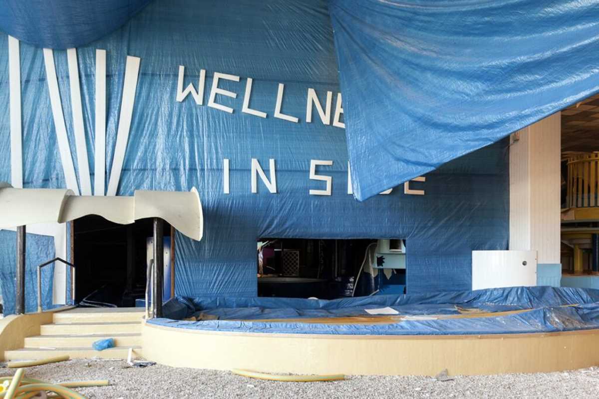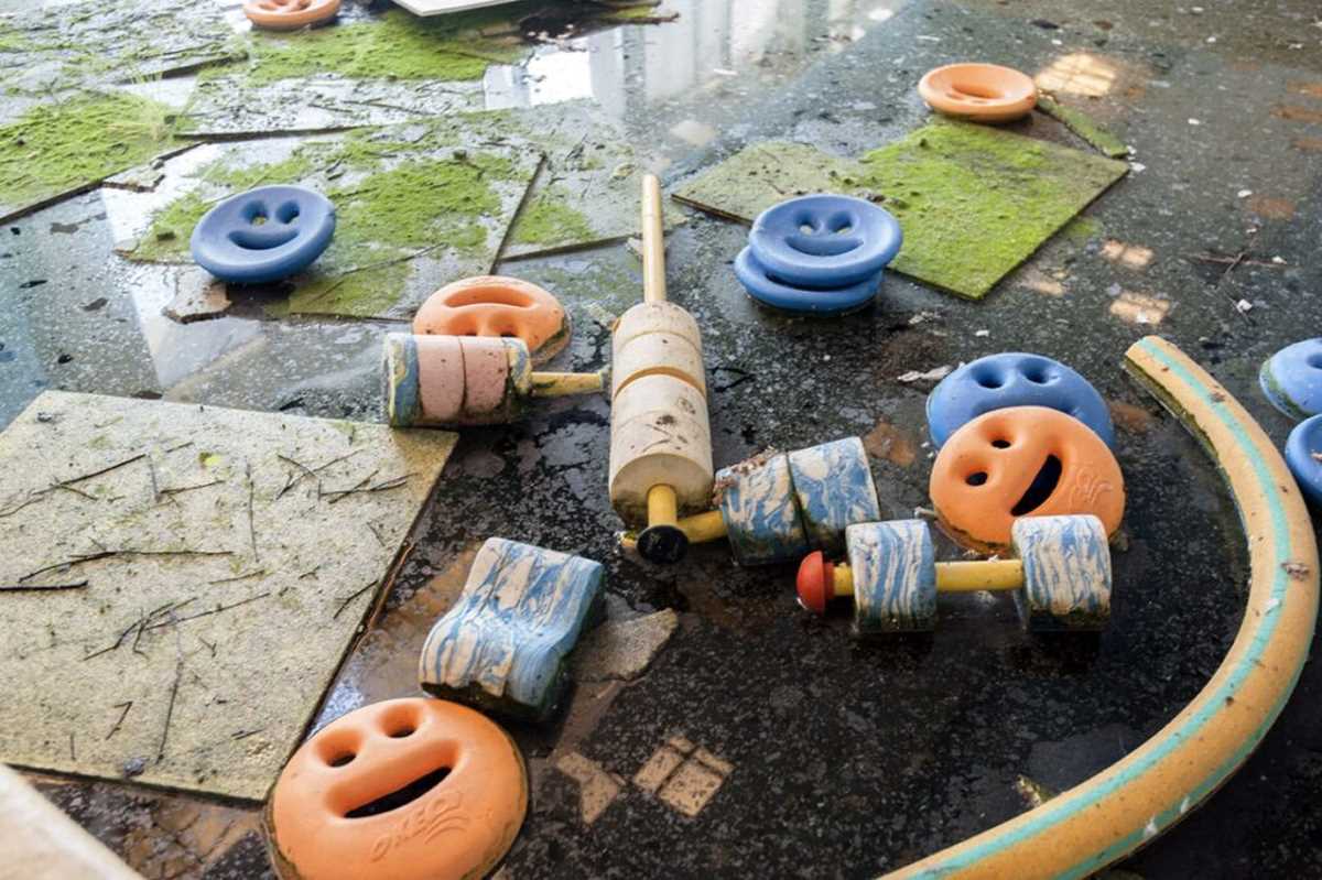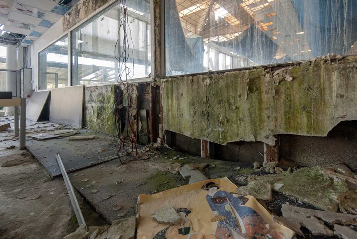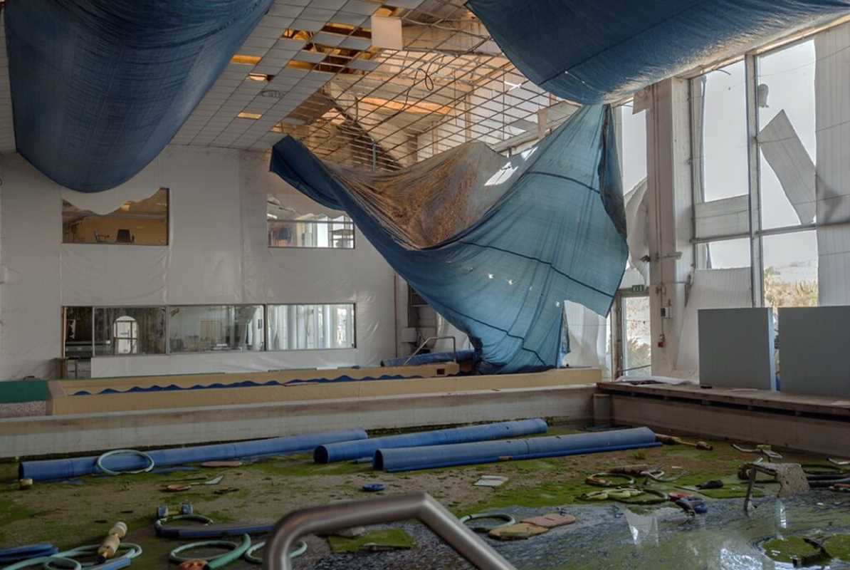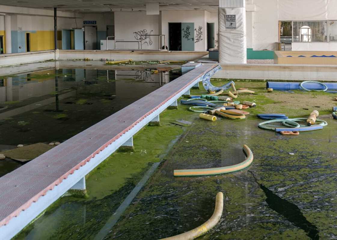 Il sopralluogo riguarda uno stabile di circa 15.000 mq., disposto su due piani, che ospitava un centro benessere tra i più grandi dell’intera regione. Disponeva di palestre, piscine, negozi e un punto di ristoro; aperto nel 2005, aveva raggiunto i 5.000 iscritti e occupava 80 dipendenti. La sua storia s’interruppe bruscamente nell’ottobre 2012, quando il Comune in cui era ubicato lo stabile emise un’ordinanza di sospensione dell’attività, contestando la mancanza di requisiti igienico-sanitari, edilizi e di sicurezza, richiesti da una legge del 2009. A questo stop forzato, negli anni fecero seguito due sentenze che diedero torto all’amministrazione comunale, tanto che ormai pende solo il giudizio d’appello al Consiglio di Stato sulla legittimità dei provvedimenti impugnati dall’imprenditore, il quale, oltre all’opposizione, ha richiesto un risarcimento danni vicino a 11 milioni di euro, con il concreto rischio per l’Ente locale di dover affrontare un corposo salasso. In questi anni, comunque, sia il Comune che l’Agenzia delle Entrate hanno richiesto e comminato sanzioni per pagamenti arretrati per un ammontare di diversi milioni di euro, pur essendo l’attività ferma dal 2012, secondo il consueto, cieco percorso della burocrazia nostrana. Insomma, una storia italiana esemplare di questi anni tormentati. L’ingresso nell’edificio non è difficile: basta oltrepassare le entrate ufficiali e spostarsi sul lato opposto, dove nel cortile, più o meno di fronte a un’imbarcazione che se sta a marcire all’aperto, esiste una vetrata antipanico di cui è rimasta solo l’intelaiatura. Si entra e ci si trova subito nell’immensa sala piscine (una per adulti e l’altra per bambini). La cosa che colpisce è il mutamento del clima rispetto all’esterno: umido, afoso e con una moltitudine di insetti e zanzare che infestano l’aria, inevitabile conseguenza delle acque rimaste nelle piscine, ormai ridotte a pozze putride e stagnanti. Per quanti volessero seguire le mie orme, ora che il sito è relativamente noto anche per effetto di una trasmissione televisiva sulle reti nazionali, raccomando di evitare di camminare sulle assi in legno, ormai marcite e traballanti, che separano le due piscine principali, e di prestare attenzione all’entrata a sinistra, di lato all’enorme scritta “Wellness inside”, perché nel minuscolo e buio corridoio laterale c’è acqua, come ho appurato di persona immergendo le mie scarpe per i primi due passi. Ovviamente si tocca, ma ho dovuto fare un repentino pit-stop nella mia auto per la sostituzione delle calzature. Superato il goffo contrattempo,sono rientrato per proseguire la visita e ho subito notato il distacco dei tendaggi e degli enormi teloni di protezione, il che comporta variazioni di luce e scorci fotografici originali. Proseguendo nella perlustrazione, ho visitato il resto dei locali, inclusi i retrostanti spogliatoi e palestre, quasi sempre avvolti nel buio, dove è stato depredato tutto ciò che poteva esserlo, e attraversato quello che probabilmente era il punto di ristoro e le cucine, anch’essi devastati. È pressoché Inutile aggiungere che ho verificato per l’ennesima volta la sollecitudine dei ladri di rame nel ripulire le strutture commerciali e industriali dismesse. Ho rinunciato a salire al secondo piano per entrare, ammesso che fosse possibile, nella zona riservata alla palestra, sia per mancanza d’interesse per le attrezzature ginniche sia perché ero già estenuato dalla lotta ingaggiata con i più insistenti moscerini della provincia. Solo uscendo ho fatto caso che sulla più piccola delle piscine, quella riservata ai bambini, galleggiavano i giochi acquatici abbandonati, coi loro colori vivaci e gli eterni sorrisi di plastica, sparsi in un’acqua che dava l’impressione di una palude, di fatto divenuta coltura per ogni specie di insetti molesti. Il posto, come dicevo, non presenta particolari problemi per essere visitato, ma occorre essere consapevoli che si entra in un luogo estremamente degradato, per cui è bene essere muniti di una torcia, un prodotto repellente per le zanzare (ma questo l’ho capito dopo) e scarpe da ginnastica di ricambio, particolarmente consigliate per i più distratti, categoria che continua ad annoverarmi tra i suoi sostenitori.